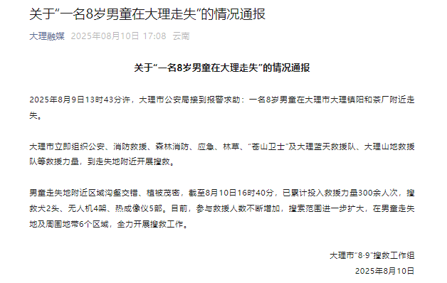 北京新闻于8月10日在云南省达利市搜救行动“ 8.9”的搜救行动部发表了有关“在达里去世的8岁 – 戈德男孩”的情况的通知。达利市迅速组织了救援部队,以进行公共安全,消防,森林大火,紧急情况,森林草等。孩子失去的地形附近的区域交织在一起,植被茂密。在8月10日的16:40,已经投资了300多个救援设备,其中包括两只狗,四个无人机和五个热图像。目前,参加救援的人数正在增加,进一步扩大了搜索范围。搜救行动将在孩子失去的地形及其周围环境的六个地区进行。 Chen Yanting编辑