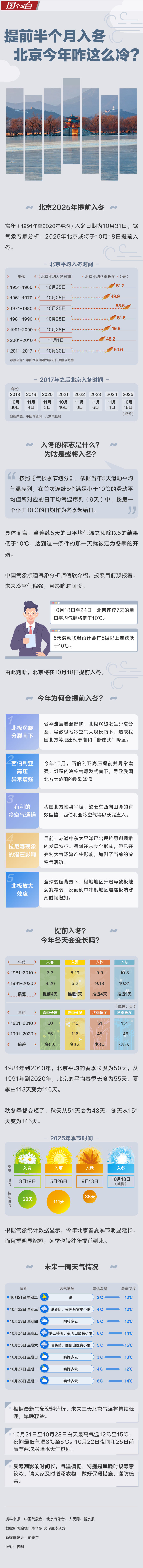代表北京气温的南郊观象台早晨气温已连续两天低于零度。据监测,南郊观测站10月20日上午最低气温为-0.5℃,21日为-0.3℃。据日本气象台称,10月16日至21日,强冷空气将从北向南流过日本大部分地区,造成今年下半年以来的最低气温。中国天气频道气象分析师辛星表示,根据目前的预测,冷锋将会更强、持续时间更长。 10月18日至24日,北京日平均气温连续7天低于10摄氏度,五日移动平均气温预计将至少连续5天低于10摄氏度。因此,北京很可能在10月18日进入冬季。从历史数据来看,平均开工时间为10月18日。北京的冬季时间是10月31日(根据1991年至2020年的数据)。今年冬天提前了半个月。那么冬季的到来会带来什么样的影响呢?冬天会更长吗?去年冬天是什么时候开始的?为什么今年冬天来得这么早?查看照片以确认。