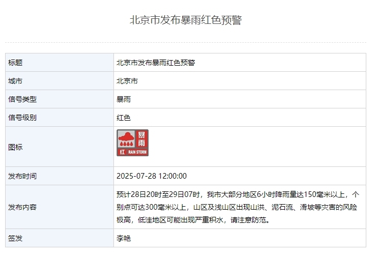 根据北京气象局的网站,北京新闻因大雨发出了红色警告。从29、28,7:00和8:00开始,大多数北京零件的六小时降雨将超过150毫米,预计有些点将达到300毫米以上。山区和浅山区的山区,滑坡,滑坡和其他灾难的风险很高,在低地地区可能会发生大量的水。小心预防。 XIN JING编辑