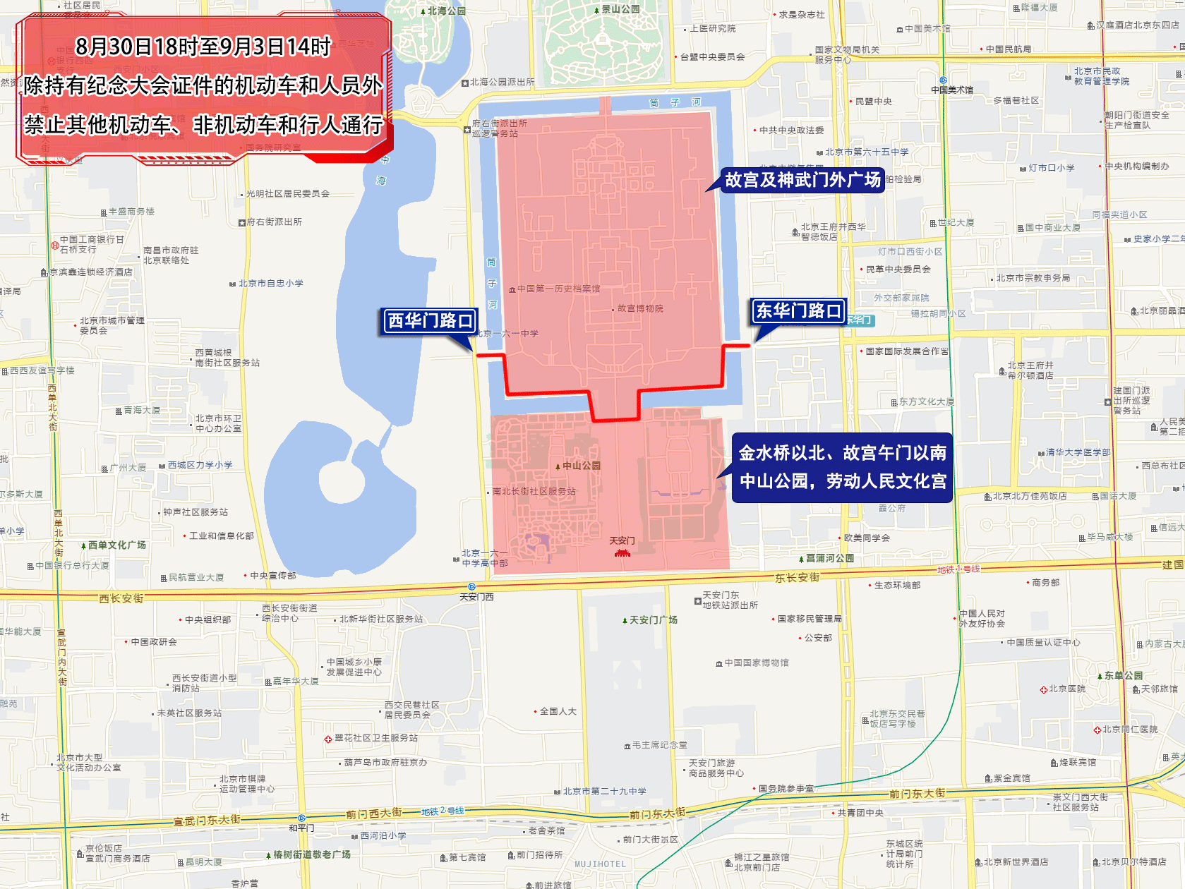 北京新闻于8月29日,北京市政公共安全办公室发出了关于在中国抵抗日本对日本入侵和世界反法西斯主义战争的胜利80周年期间实施临时交通管制措施的通知。全文如下:抵抗日本攻击战争80周年和关于获得临时交通管制措施的纪念会议,纪念于2025年9月3日纪念会议,史诗般的会议(会议),纪念中国胜利的80周年胜利,胜利的胜利和反对世界攻击的袭击事件的攻击序列的攻击序列,是战争的进攻,是战争的攻击,是攻击的进攻,是攻击的攻击,是攻击的进攻,他们在战争图片中画作的画中的画中庆祝的攻击。北京为保证纪念会议的安全性和柔软性,已经决定进行测量ES将根据法律和道路交通安全法规的相关规定,是天安门地区的临时管理以及相关道路和部分的各个方面。相关问题宣布如下:1。下午6:00。 8月30日至下午6:00从9月3日起,位于天安门门门前的金胡岛桥以北,而donghehehe,donguhehehehe,Donguhehehe,Donguamihe,Donguamihe,Donguamihe,Donguamihe,Donguamihe,Donguhehehe,Donguhehehe,Donguhehehe,Donguamihe,Donguamihe,Donguamihe,Donguamihe,Donguamihe Donguamihuhuhuhuhuhuhuhuhuhuhuhuhuhuhuhuhuhuhuhuhuhuhuhuhuhuhuhuhuhuhuhuhuhuhuhuhuhuhuhuhue street) except that cars and personnel who have certificates of commemorative conference cars, vehicles that do not move and pedestrians禁止通过。 2。从9月2日至14:00从9月4日下午7:30到9月4日,上午1:00到1:00,9月4日上午1:00至下午1:00。 9月4日,禁止其他汽车,非运动车和行人通过相关的DEChang Load的分区,South Coe汽车官员。 3. 9月2日的11:00 9月3日22:00,其他汽车,非运动车和行人被禁止穿越Xinda Road,除了汽车和员工带有纪念会议证书。下午9:30的第四名9月2日至9月3日,下午9:00,晚上9:30在胡尤街的北部出发,从东,拜尤瓦街,盆地街,Qianmen East Street,Chongwenmen West Street和Chongwen Road交叉路口,再到北京Zhanmen Road,这条街和Hepingmen East Street(南部)东部(除外)(除外)(除外(除外)(除外)(除外)到西门(Def)的西门(Def)到东街(Jinyu Hutong)东部(除)东部,贝德汉·温琼(Beedhan Wenjin)路(Beedhan Wenjin Road)在dong Hamen Road的交汇处的Beedhan Wenjin Road街道街道;街,贝哈伊南门街,基恩·西街,基恩·曼西街,基恩·曼西街,街街,Qianmen East da街,张阳市场停车场,新华社南部,Qie Nian Street,东达莫工厂街。 (Dawa除外)将是NG桥(除),而广告路从点(不包括)到鸟类路的东部激情。除了该通过的车辆和人员禁止,他们拥有纪念会议证书,其他车辆,非木马车辆和行人。 7.从9月3日的0:00到2:00,东第二环路将从Chaoyangmen Bridge(除)到Dongbianmen Bridge(除外)。汽车,没有移动的车辆和行人被禁止通过。车辆和行人可以去东部和西部以及西部。 8. 9:30 am-13:00,9月3日,从Fuxingmenwai Street,Fuxing Road Muxidi Bridge(除)。其他车辆,车辆除了拥有纪念会议证书的汽车和人员外,禁止不移动的行人和行人。从上午10:00到下午11:00从9月3日开始,西第二环路从船长桥到关岛桥(除)到主要和辅助道路。除了该通过的车辆和人员禁止,他们拥有纪念会议证书,其他车辆,非木马车辆和行人。从上午10:00到下午12:00从9月3日起,东第二环路将从Donggimen桥(除)到Dongbienme桥(除外)。机动车,看到不动的他们,禁止行人通过。车辆和行人可以向东和向西穿过Donggimen North Bridge和Guangdong Bridge。 11月3日,从9月3日上午10:10到上午11:30,张从Pinganli West Street,Dianmen West Street,Dianman East Stree,Dianmen West Streett,通往唐·西萨科奥(Don Sizaokiao)的钟路。 12.门票将于9月3日从10:40到12:30从10:40到12:30,用于拥有纪念会议证书,其他车辆,不是动作和行人的车辆的车辆和人员。 13.下午6:00到9月3日至22:00,Chang A街将在Huyustri举行。从(除)的南部出发到Nanchiji的南入口(除外)。除了该通过的车辆和人员禁止,他们拥有纪念会议证书,其他车辆,非木马车辆和行人。 14.不去北京车站的汽车和车辆可以从Dong Bianmemun桥,Chong Wenman East Street,北京西街车站,北京东街和East Second Ring Road Station分发。除了以前的地区和道路外,交通管理部门还将采取适当的措施,以在几条道路上进行临时交通管制,具体取决于On国家和外国活动的需求。在控制期间,交通管理部门将遵守“不打扰人们,不打扰人们”的原则,最大程度地减少控制时间和控制范围,增加社交运输的方向和解放,并尽一切可能为人们的旅行服务。如果调整了控制时间,将通过促销媒体快速通知它。邀请社会单位和公众了解,支持和合作,以临时的交通管制措施,组织时间和方法的时间,路线和方法,并避免旅行期间的区域和控制路线。对于给此带来的任何不便,我们深表歉意。这将通知您。北京公共安全办公室的编辑,2025年8月29日